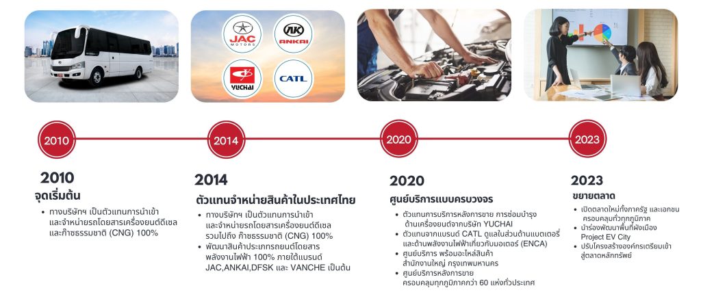 ได้เริ่มต้นการเดินทางในอุตสาหกรรมยานยนต์เชิงพาณิชย์มาตั้งแต่ปี 2010 โดยในยุคแรกเริ่ม เราคือผู้เชี่ยวชาญและเป็นตัวแทนนำเข้าและจัดจำหน่ายรถโดยสารที่ใช้ เครื่องยนต์ดีเซล และก๊าซธรรมชาติ ด้วยประสบการณ์และความเข้าใจตลาดขนส่งและรถโดยสารอย่างลึกซึ้ง TTD Thailand เล็งเห็นถึงการเปลี่ยนแปลงของทิศทางพลังงานโลก เราจึงไม่หยุดนิ่งที่จะพัฒนาต่อยอดมาเป็น TTD thailand ในปัจจุบัน ซึ่งเป็นผู้เชี่ยวชาญด้านการขับเคลื่อนพลังงานใหม่